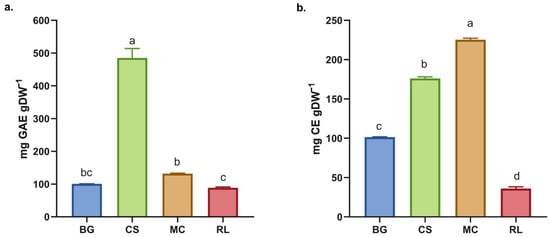 (a) Total phenol content (TPC) and (b) total flavonoids content (TFC) in the dry extract of native plants. BG = Buddleja globosa. CS = Cissus striata. MC = Mitraria coccinea. RL = Raukaua laetevirens. A one-way ANOVA was performed; different letters denote statistically significant differences according to Tukey’s test (p < 0.05).
