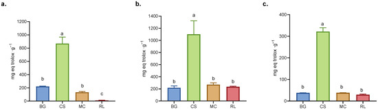 Antioxidant capacity: (a) FRAP, (b) ABTS, and (c) DPPH assays. BG = Buddleja globosa. CS = Cissus striata. MC = Mitraria coccinea. RL = Raukaua laetevirens. A one-way ANOVA was performed; different letters denote statistically significant differences according to Tukey’s test (p < 0.05).