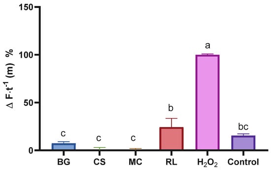 Percentage of intracellular ROS change in cells treated with different plant extracts. Bars with the same letter are not significantly different according to Tukey’s multiple comparison test (p < 0.05). Values are expressed relative to the positive control (H2O2), with ‘Control’ representing untreated cells. BG: Buddleja globosa; CS: Cissus striata; MC: Mitraria coccinea; RL: Raukaua laetevirens.