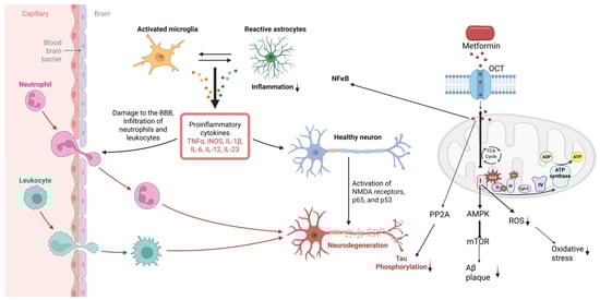 Metformin-mediated mechanisms regulating neuroinflammation, oxidative stress, and BBB dysfunction. Metformin enters cells through organic cation transporters (OCTs) and activates AMPK, leading to reduced mTOR signaling, decreased ROS production, and attenuation of oxidative stress. These intracellular pathways-including AMPK activation, PP2A modulation, mitochondrial complex interactions, NFκB suppression, and reduced tau phosphorylation, are supported primarily by preclinical in vitro and in vivo studies. Metformin-mediated reductions in circulating pro-inflammatory cytokines (IL-6, TNF-α, IL-1β) and improvements in systemic inflammation, endothelial function, and metabolic status are supported by clinical evidence in human studies. Although Aβ plaques and tau hyperphosphorylation are well-established clinical biomarkers of Alzheimer’s disease, the effects of metformin on these processes have not been demonstrated in human clinical studies and, therefore, are represented here as preclinical mechanisms. The figure also depicts preclinical evidence showing that metformin mitigates microglial activation, astrocytic reactivity, leukocyte infiltration across a compromised BBB, and downstream neurodegeneration. Clinical and preclinical elements are distinguished in the text to clarify translational relevance.