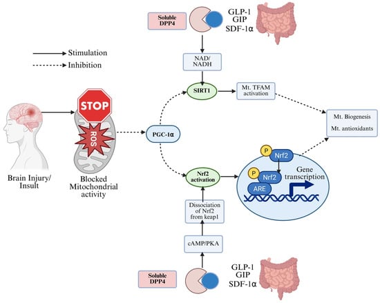 Proposed mechanisms through which DPP-4 inhibitors and endogenous incretin hormones (GLP-1, GIP, SDF-1α) modulate mitochondrial function, oxidative stress, and Nrf2 signaling. Binding of incretin hormones to their receptors enhances cAMP/PKA signaling, promotes dissociation of Nrf2 from Keap1, and increases Nrf2-mediated transcription of antioxidant response genes (ARE). Upstream regulators including SIRT1, PGC-1α, and TFAM contribute to mitochondrial biogenesis and the production of mitochondrial antioxidants. These intracellular mechanisms—such as SIRT1 activation, PGC-1α upregulation, TFAM activation, Nrf2 phosphorylation, and increased mitochondrial antioxidant capacity—are supported primarily by preclinical in vitro and in vivo studies. In clinical settings, DPP-4 inhibitors have been shown to improve glycemic control, enhance systemic antioxidant capacity, reduce circulating ROS markers, and modestly improve inflammatory profiles; however, their direct effects on mitochondrial biogenesis, Nrf2 signaling, and neuronal protection have not yet been demonstrated in human studies and remain preclinical mechanisms. The reduction in oxidative stress following GLP-1 elevation is supported by clinical evidence at the systemic level, while the detailed mitochondrial signaling pathways illustrated here are derived from preclinical models.