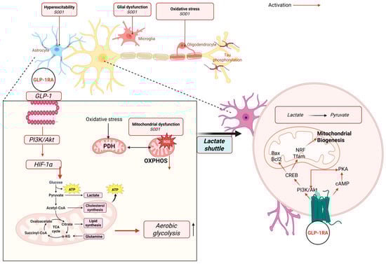 Proposed mechanisms through which GLP-1 receptor agonists (GLP-1RAs) modulate mitochondrial function, oxidative stress, neuronal metabolism, and glial activity. Activation of the GLP-1 receptor stimulates downstream PI3K/Akt and cAMP/PKA signaling, leading to enhanced HIF-1α activity, increased aerobic glycolysis, and improved metabolic flexibility. GLP-1RA signaling promotes mitochondrial biogenesis through CREB, NRF, and TFAM activation, reduces mitochondrial ROS production, and supports lactate shuttling between astrocytes and neurons. These intracellular mechanisms—including PDH regulation, OXPHOS rescue, reduced oxidative stress, astrocyte–neuron lactate coupling, modulation of SOD1-related dysfunction, and attenuation of tau phosphorylation—are supported primarily by preclinical in vitro and in vivo models. Clinically, GLP-1RAs have been shown to improve systemic inflammation, reduce circulating oxidative stress markers, enhance metabolic control, and exert neuroprotective effects indirectly through improved insulin sensitivity and reduced cardiometabolic burden. However, direct effects of GLP-1RAs on neuronal mitochondrial biogenesis, lactate shuttling, astrocyte or microglial activity, hyperexcitability, and tau-related pathology have not been demonstrated in human studies and therefore remain preclinical mechanisms. This distinction clarifies the translational relevance of the pathways illustrated.