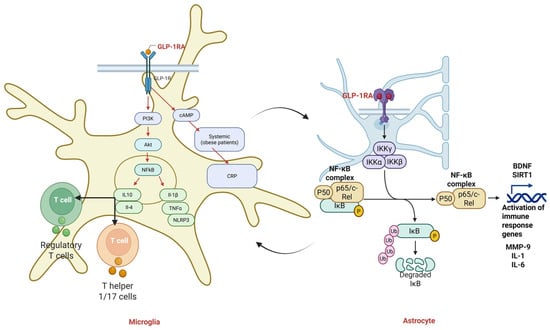 GLP-1 receptor agonist (GLP-1RA) modulation of microglial and astrocytic inflammatory pathways. Activation of GLP-1R on microglia engages PI3K/Akt and cAMP signaling, leading to downstream inhibition of NF-κB and reduced production of pro-inflammatory cytokines (IL-1β, TNF-α) and NLRP3 inflammasome activity, while promoting anti-inflammatory cytokines such as IL-10 and IL-4. GLP-1RA signaling also influences T-cell polarization by promoting regulatory T cells and reducing Th1/Th17-associated responses. In astrocytes, GLP-1RA activation reduces NF-κB signaling by inhibiting IKKα/β/γ-dependent phosphorylation and degradation of IκB, thereby limiting transcription of pro-inflammatory genes and promoting neurotrophic factors such as BDNF and SIRT1. These intracellular immunomodulatory mechanisms—including NF-κB inhibition, IKK complex regulation, modulation of T-cell–microglia interactions, and downregulation of MMP-9, IL-1, and IL-6, are supported primarily by preclinical in vitro and in vivo studies. Clinically, GLP-1RAs reduce systemic inflammatory markers such as CRP and IL-6 and improve metabolic and cardiometabolic status; however, direct effects of GLP-1RAs on microglial or astrocytic NF-κB signaling, T-cell–microglia crosstalk, or neuroimmune gene expression have not yet been demonstrated in human CNS tissues and therefore remain preclinical mechanisms. This distinction clarifies the translational relevance of the pathways depicted.
