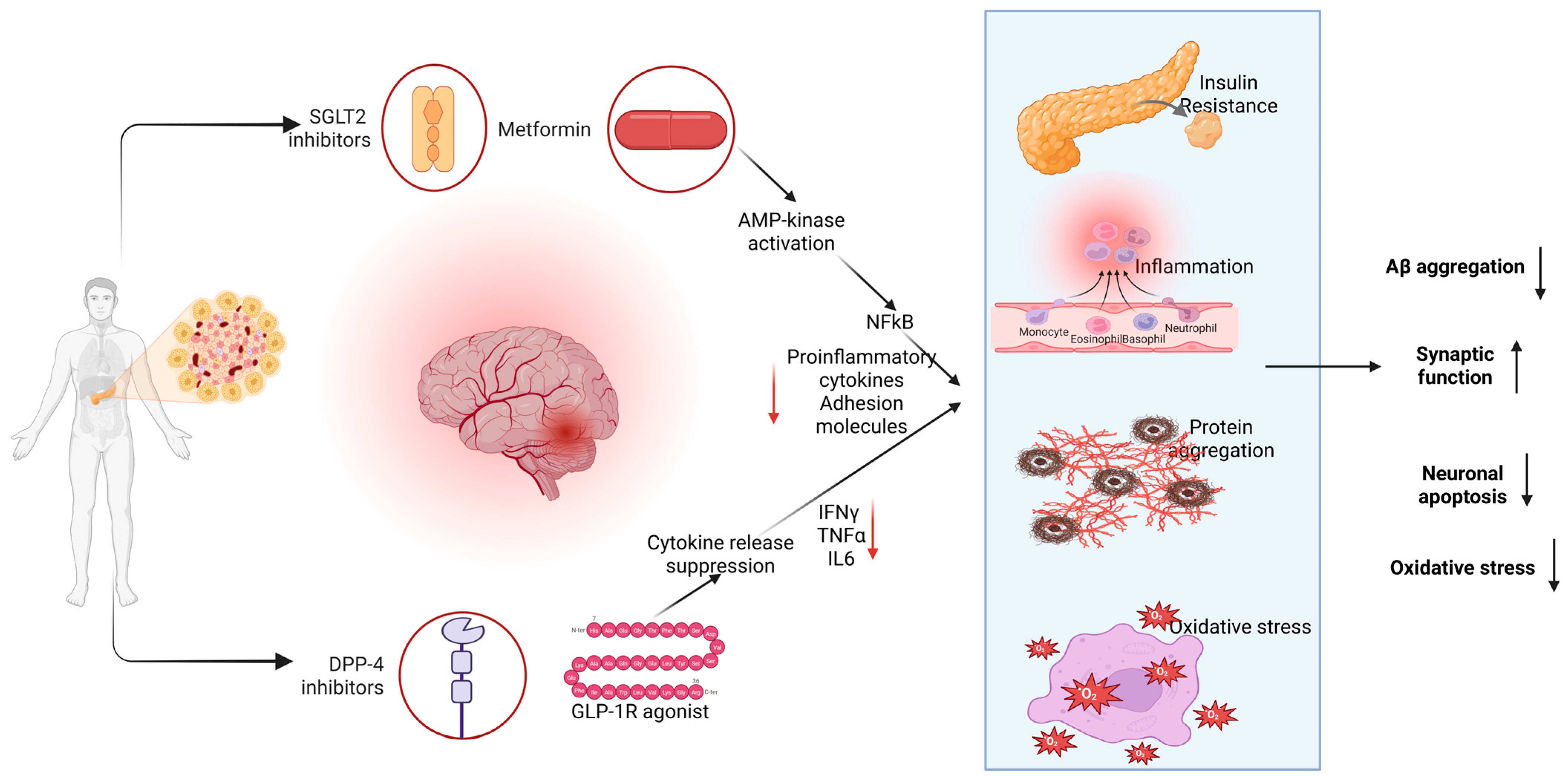 - Sim, A.Y.; Kim, J.Y.; Lee, Y.H.; Lee, J.E. Neuroprotective roles of SGLT2 and DPP4 inhibitors: Modulating ketone metabolism and suppressing NLRP3 inflammasome in T2D induced Alzheimer’s disease. Exp. Neurol. 2025, 390, 115271. [Google Scholar] [CrossRef] [PubMed]