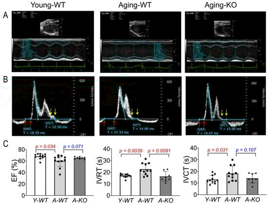 Echocardiographic analyses of left ventricular function in Y-WT, A-WT, and A-KO mice: (A) parasternal long axis view images in M-mode; (B) pulsed wave (PW) Doppler mode images; (C) mean data of EF, IVRT, and IVCT. Data are presented as mean ± SD, with n = 8–11 per group.