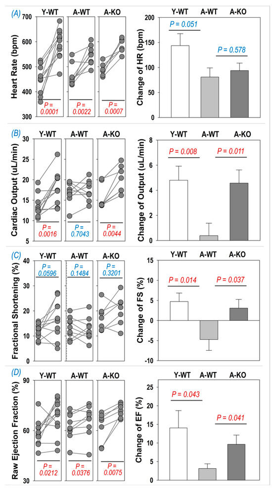 Dobutamine-induced increase in heart rate (A), cardiac output (B), fractional shortening (C), and ejection fraction (D) in Y-WT, A-WT, and A-KO mice. The left subpanels depict raw values of each mouse before and after dobutamine treatment, while the right subpanels show the change in heart rate, cardiac output, fractional shortening, and ejection fraction. Data are presented as mean ± SD, with n = 7–8 per group.