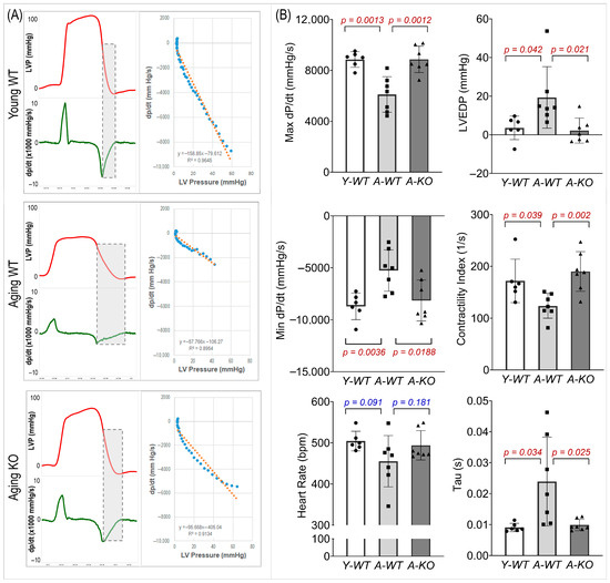 Representative hemodynamic recordings (A) and calculated functional parameters (B) of the left ventricle of mice in the Y-WT, A-WT, and A-KO groups. Data are presented as mean ± SD, with n = 6–7 per group.