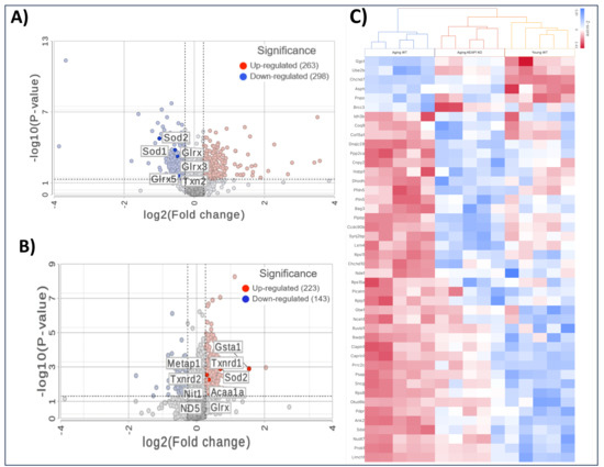 Comparing the A-WT mice with the Y-WT mice in the proteomics LFQ study, we observed profound alterations in cardiac protein expression profiles, indicative of age-related molecular remodeling. As can be seen in Figure 6A, 561 proteins were significantly differentially expressed, including 298 downregulated and 263 upregulated proteins. Several antioxidant proteins were found to be downregulated in the A-WT mice compared to their younger counterparts. Among these downregulated antioxidant proteins were Superoxide Dismutase 1 (SOD1), Superoxide Dismutase 2 (SOD2), Thioredoxin 2 (Txn2), and Glutathione S-Transferase kappa 1 (Gstk1), as shown in the volcano plot. In addition to antioxidant proteins, the proteomics LFQ analysis identified several other proteins implicated in various biological processes associated with aging, including mitochondrial proteins Frataxin (Fxn), Mimitin (Ndufaf2), and structural proteins, such as Collagen (Col15a1) and Muscleblind (Mbnl1), which were downregulated in the A-WT mice.
