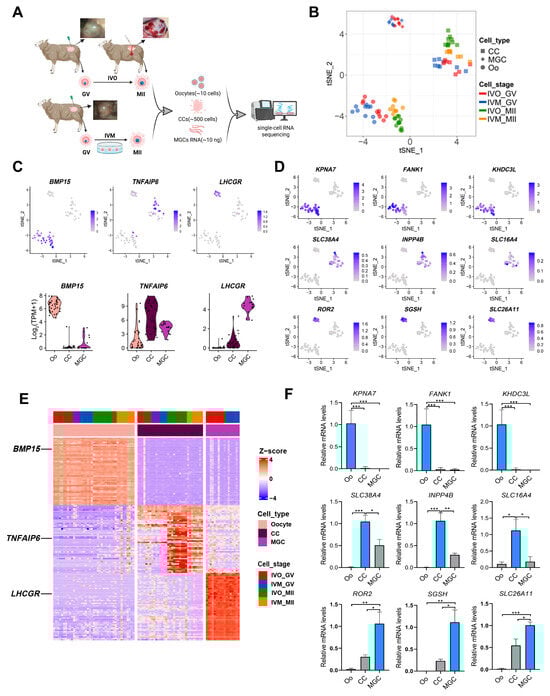 Global transcriptomes profiling of sheep oocytes and granulosa cells from in vivo and in vitro matured oocytes. (A) A schematic illustration of the study workflow. (B) The tSNE plots of oocytes and granulosa cells from the study, indicated by colors for different maturation stages and sources. Circles indicate oocytes (Oo), squares indicate cumulus cells (CC), and diamonds represent mural granulosa cells (MGC). (C) Expression patterns of oocyte, CC, and MGC marker genes exhibited on tSNE plots and Violin plots; a gradient of gray to blue indicates the low to high gene expression level. (D) Heatmap showing expression signatures of top 50 specifically expressed genes in each cell type; the value for each gene is row-scaled Z score. (E) Expression of the candidate cell-type-specific marker genes of oocyte, CC and MGC on tSNE plots. (F) RT-qPCR validation of candidate cell-type-specific marker genes of oocyte, CC and MGC. Statistical significance: * p < 0.05, ** p < 0.01, *** p < 0.001.