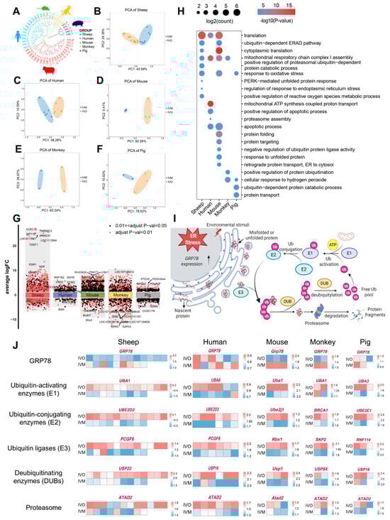 Conserved features of oocyte maturation: comparing in vivo and in vitro environments across species. (A) Hierarchical clustering of the transcriptome landscape of oocyte from in vivo and in vitro matured oocytes across different species; different colors represent different species: red, sheep; blue, human; green, mouse; yellow, monkey; and purple, pig. (B–F) Principal component analysis (PCA) comparing in vivo- and in vitro matured oocytes across multiple species. (G) Differential gene expression analysis shows up- and down-regulated genes in oocytes from in vivo and in vitro matured oocytes across different species. An adjusted p-value < 0.01 is indicated in red, while an adjusted p-value < 0.05 (but ≥0.01) is indicated in black. (H) GO enrichment of differential genes in oocytes from in vivo and in vitro matured oocytes across different species. (I) Transcriptomic analysis reveals ubiquitin-mediated degradation of protein aggregates in response to stimuli. (Created in BioRender. Cui, J. (2025) https://BioRender.com/0d7d9kl accessed on 7 December 2025). (J) Heatmaps showing scaled expression levels of endoplasmic reticulum (ER) stress marker GRP78 and ubiquitin-proteasome pathway components (E1, E2, E3, DUBs, proteasome) across multiple species.