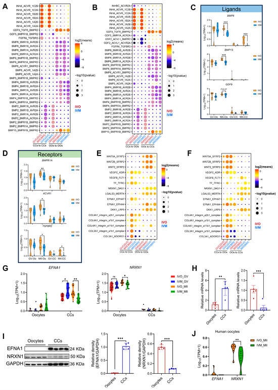 Ligand–receptor interactions between oocytes and cumulus cells in different maturation environments. (A,B) CellPhoneDB analysis of TGF-β/BMP signaling interactions between oocytes and cumulus cells (autocrine and paracrine) in different maturation environments. GVC, GV stage-cumulus cell; MIIC, MII stage-cumulus cells; GVO, GV oocyte; MIIO, MII oocyte. (C,D) Violin plots of selected TGF-β/BMP signaling ligand and receptor genes in oocytes and cumulus cells. (E,F) Distinct ligand–receptor interactions between oocytes and cumulus cells (autocrine and paracrine) in in vivo versus in vitro maturation (IVM) environments. (G) EFNA1 and NRXN1 expression was shown in violin plots. (H,I) Expression of EFNA1 and NRXN1 mRNA and protein expression levels in oocytes and cumulus cells. (J) Expression of EFNA1 and NRXN1 in human oocytes was visualized using violin plots. Statistical significance: * p < 0.05, ** p < 0.01, *** p < 0.001.