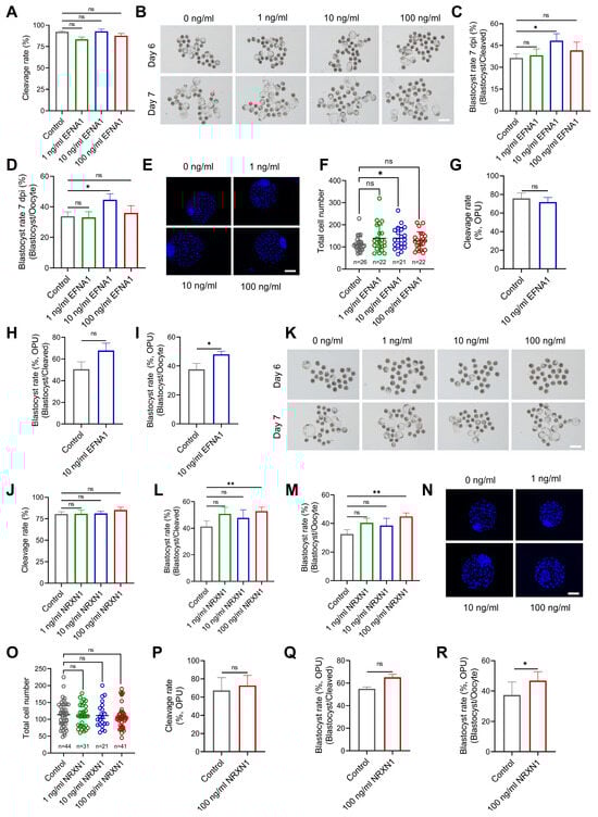 To investigate the functional impact of EFNA1 and NRXN1 on ovine oocyte maturation, each cytokine was individually added to a chemically defined IVM medium. Slaughterhouse-derived oocytes were matured for 24 h, fertilized in vitro, and cultured for 7 days. Individual treatment with EFNA1 (10 ng/mL) or NRXN1 (100 ng/mL) significantly improved oocyte developmental competence, as evidenced by elevated blastocyst yields relative to both initial oocyte numbers and cleaved embryos (Figure 5A–D, J–M). EFNA1 supplementation markedly increased total blastocyst cell numbers, indicating a pronounced enhancement in embryo quality, while NRXN1 did not alter blastocyst cellularity (Figure 5E,F,N,O).