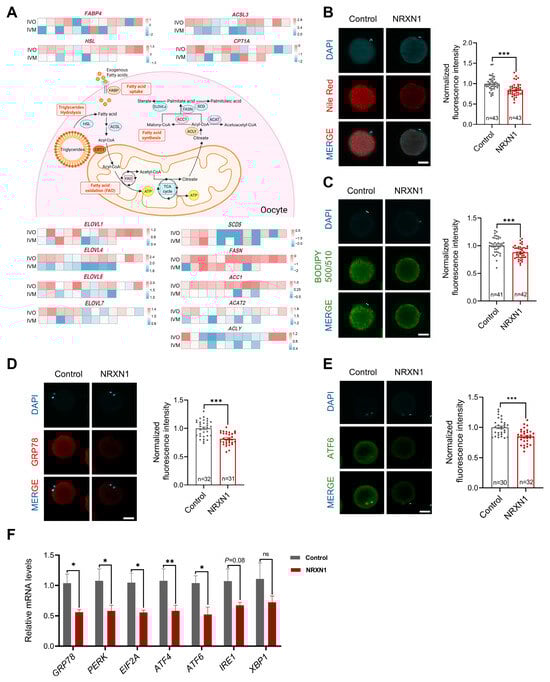 NRXN1 mitigates aberrant lipid deposition and ER stress in oocytes during IVM. (A) Heatmaps showing scaled expression levels of lipid metabolism genes in oocytes from in vivo and in vitro matured oocytes. (Created in BioRender. Cui, J. (2025) https://BioRender.com/onf1fa2 accessed on 7 December 2025). (B) Effect of 100 ng/mL NRXN1 on lipid droplets content in matured sheep oocytes. Intracellular lipid droplets content was measured using Nile-red (Scale bar = 50 µm). (C) Effect of 100 ng/mL NRXN1 on fatty acid contents in matured sheep oocytes. The lipid content was determined by BODIPY 500/510 labeling (Scale bar = 50 µm). (D,E) Immunofluorescence detection of ER stress-associated protein (GRP78, ATF6) in oocytes cultured with or without NRXN1 (Scale bar = 50 µm). (F) Relative expression levels of ER stress-associated genes (GRP78, PERK, EIF2A, ATF4, ATF6, IRE1, XBP1) in oocytes cultured with or without NRXN1 as analyzed by RT-PCR. Statistical significance: * p < 0.05, ** p < 0.01, *** p < 0.001.