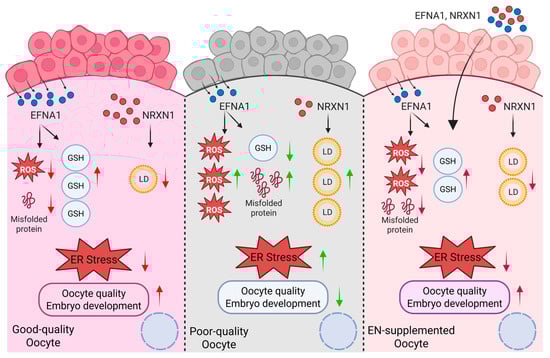 Schematic model illustrating EFNA1 and NRXN1 in promoting oocyte developmental competence (Created in BioRender. Cui, J. (2025) https://BioRender.com/o1mm3e0 accessed on 7 December 2025).