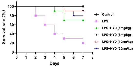 Kaplan–Meier survival curves for LPS-induced septic mice treated with varying doses of hydralazine. Mice were monitored for 14 days, and all mortality occurred within the first 7 days (n = 10 per group).