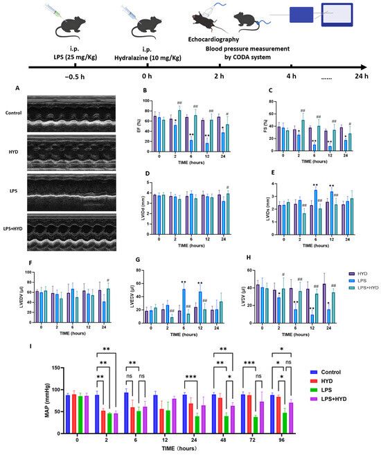 Having established the severity of LPS-induced cardiac dysfunction, we next evaluated the therapeutic potential of hydralazine administered during the early septic phase (30 min post-LPS). Cardiac function and hemodynamics were serially monitored after LPS challenge, with hydralazine administered 30 min post-LPS.