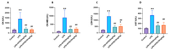 Effects of LPS-induced sepsis and hydralazine on myocardial injury markers (CK, CK-MB, LDH and AST) levels in the blood plasma (n = 6 for each group). Mice were randomly divided into four groups (LPS, LPS + HYD 5 mg/kg, LPS + HYD 10 mg/kg and Control). LPS + HYD and LPS groups were administered LPS at a dose of 25 mg/kg via i.p. injection, after 30 min received hydralazine (5 mg/kg or 10 mg/kg) or equal saline, respectively. Control group was administered equal saline. The measurements were taken at 24 h post-LPS injection, during the acute phase of septic shock. (A). CK, creatine kinase; (B). CK-MB, creatine kinase MB; (C). LDH, lactate dehydrogenase (LDH); (D). AST aspartate aminotransferase. * p < 0.05 and ** p < 0.01 vs. the control group, ## p < 0.01 vs. the LPS group.