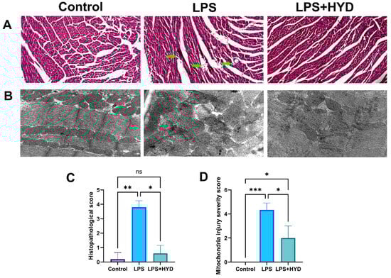 Cardiac tissues from the Control, LPS, and LPS + HYD (10 mg/kg) groups were used for ultrastructural evaluation. Following euthanasia, mouse hearts were perfused with cold saline and dissected into 1 mm3 cubes. The tissue cubes were fixed in 2.5% glutaraldehyde for at least 3 h, followed by post-fixation in 1% osmium tetroxide for 1 h. Subsequently, samples were dehydrated through a graded ethanol series, stained with 2% uranyl acetate, and embedded in resin overnight. Ultrathin sections (approximately 70 nm) were collected on copper grids and examined using a JEM1400 transmission electron microscope (JEOL Ltd., Tokyo, Japan) operating at an accelerating voltage of 80 kV.