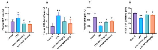 The level of plasma MDA (0.46 ± 0.11 μmol/L) in the LPS group was significantly higher than the control group (0.34 ± 0.06 μmol/L) (p < 0.05). Compared to the LPS group, MDA levels were significantly lower in the LPS + HYD (5 mg/kg) group (0.28 ± 0.04 μmol/L) and the LPS + HYD (10 mg/kg) group (0.26 ± 0.01 μmol/L) (p < 0.05) (Figure 7A).