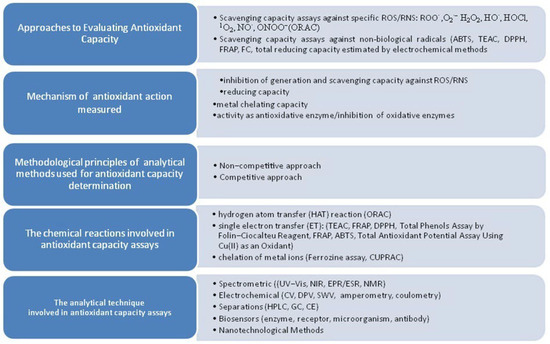 An imbalance between the oxidative and antioxidant systems can lead to an increase in the production of reactive oxygen/nitrogen species (ROS/RNS), which play an important role in the development of many diseases [1]. Natural dietary antioxidants (AOs), such as vitamins, carotenoids, polyphenolic compounds and flavonoids, can reduce oxidative stress and slow the development of diseases by delaying or preventing oxidation [2]. Several methods have been developed to determine the antioxidant capacity (AOxC) of various samples, including supplements, foods, and plant extracts [3,4]. These approaches can be categorized depending on the criterion applied. Figure 1 presents the selected criteria for characterizing AOxC tests [5].