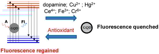 - Zhu, S.; Yan, X.; Qiu, J.; Sun, J.; Zhao, X.E. Turn-on fluorescent assay for antioxidants based on their inhibiting polymerization of dopamine on graphene quantum dots. Spectrochim. Acta A Mol. Biomol. Spectrosc. 2020, 225, 117516. [Google Scholar] [CrossRef]