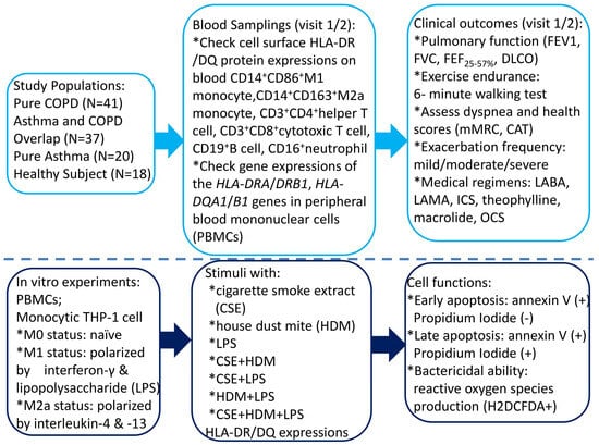Recent research utilizing an animal model has shown that ACO mice exhibit significantly more extensive inflammation compared to those with COPD or asthma, with antigen presentation pathways, such as HLA-DRA, playing a key role [25]. The absence of a clearly defined ACO classification underscores the importance of identifying specific biomarkers that can aid in distinguishing this phenotype. Targeting this subgroup of patients is crucial for advancing mechanistic studies and facilitating tailored therapeutic approaches. Current investigations into HLA-DR/DQ expression across various immune cells in COPD or asthma patients remain scarce, and debates continue regarding the influence of HLA class II expression on the clinical characteristics of COPD, asthma, and ACO. Furthermore, it has been established that down-regulated HLA-DR correlates with diminished monocyte responsiveness and poor outcomes in sepsis. In stable COPD, where pulmonary microorganism colonization is prevalent in approximately 40% of cases, these conditions are linked to frequent exacerbations and progressive lung function deterioration [26,27].