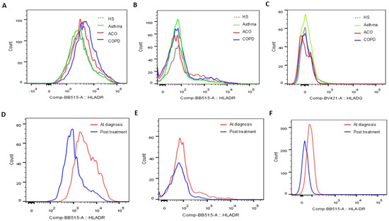 Representative histograms showing (A) HLA-DR protein expression determined on blood CD14+CD163+ M2a populations, (B) HLA-DR protein expression on blood CD3+CD4+ helper T cell populations, and (C) HLA-DQ protein expression on blood CD3+CD8+ cytotoxic T cell populations at the first study enrollment (visit 1). Representative histograms showing HLA-DR protein expression determined on blood (D) CD14+CD163+ M2a, (E) CD3+CD4+ helper T cell, and (F) CD16+ neutrophil populations before and after 1-year medical treatment (visits 1 and 2).