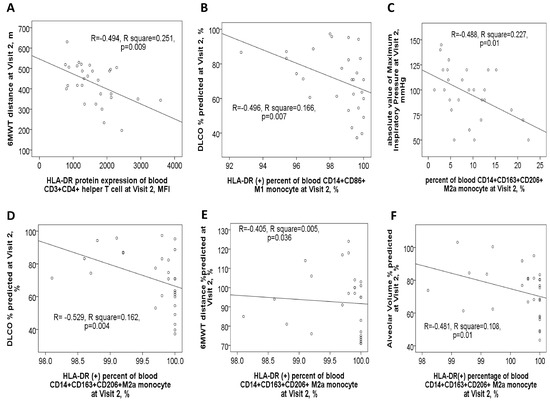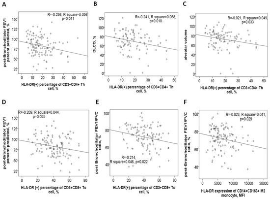 HLA-DR protein expression in blood immune cells correlates with clinical characteristics. HLA-DR expression of helper T cells was negatively correlated with (A) post-bronchodilator (BD) forced expiratory volume in 1 s (FEV1) %predicted value, (B) diffusion capacity of carbon monoxide (DLCO) %predicted value, and (C) alveolar volume %predicted value. HLA-DR expression of cytotoxic T cells was negatively correlated with (D) post-BD FEV1% predicted value and (E) post-BD FEV1/FVC ratio. (F) HLA-DR expression of M2a monocyte was negatively correlated with post-BD FEV1/FVC ratio.
