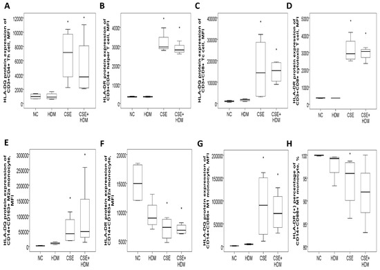 HLA-DR and HLA-DQ protein expressions of peripheral blood mononuclear cells from four healthy subjects in response to cigarette smoke extract (CSE) and house dust mite (HDM) stimuli in vitro. (A) HLA-DQ and (B) HLA-DR protein expressions of CD3+CD4+ helper T (Th) cells were both increased with CSE or CSE+HDM stimuli but not with HDM alone stimuli. (C) HLA-DQ and (D) HLA-DR protein expressions of CD3+CD8+ cytotoxic T (Tc) cells were both increased with either CSE or CSE+HDM stimuli, but not with HDM alone stimulus. (E) HLA-DQ protein expression of CD14+CD163+ M2a monocyte was increased with CSE or CSE+HDM stimuli, while (F) HLA-DR protein expression was decreased. (G) HLA-DQ protein expression of CD14+CD86+ M1 monocyte was increased with CSE or CSE+HDM stimuli, while (H) HLA-DR protein expression of M1 monocyte was decreased with CSE stimulus. * p < 0.05 compared with normal culture medium control (NC).
