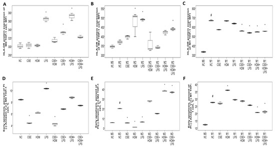 Similarly, HLA-DQA1 gene expression increased in response to HDM or LPS stimuli at both M0 and M2 stages. However, it decreased under HDM+LPS, CSE+HDM, CSE+LPS, and CSE+HDM+LPS conditions following M1 polarization (see Supplementary Figure S6A,C,E). As for HLA-DQB1 expression, it rose with LPS stimulation at M0, with HDM or LPS at M2, and with CSE stimulation at M1. Nonetheless, it decreased under CSE+HDM, CSE+LPS, HDM+LPS, or CSE+HDM+LPS conditions irrespective of the polarization state (refer to Supplementary Figure S6B,D,F).