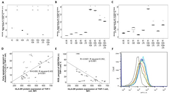 Bactericidal function and its correlation with HLA-DR protein expressions of THP-1 cells in response to cigarette smoke extract (CSE), house dust mite (HDM), and lipopolysaccharide (LPS) stimuli in vitro. (A) Reactive oxygen species (ROS) production (percent of H2DCFDA (+) cells) of M0 THP-1 cells was increased with CSE, CSE+HDM, CSE+LPS, or CSE+HDM+LPS stimuli. (B) ROS production of M2 THP-1 cells was not significantly changed versus M0 status, but increased with CSE+HDM/CSE+LPS/HDM+LPS/CSE+HDM+LPS stimuli. (C) ROS production of M1 THP-1 cells was not significantly changed versus M0 status, but increased with HDM+LPS, CSE+HDM, CSE+LPS, or CSE+HDM+LPS stimuli. HLA-DR protein expression of THP-1 cells was positively correlated with (D) early apoptosis, and negatively with (E) ROS production at M0, M1, and M2 statuses. (F) A representative histogram showing HLA-DR protein expression determined on M0 THP-1 of NC (black dashed line), M1 polarized THP-1 of NC (light blue line), and M1 polarized THP-1 cells in response to various stimuli (other colors). * p < 0.05, compared with norma culture medium control (NC).
