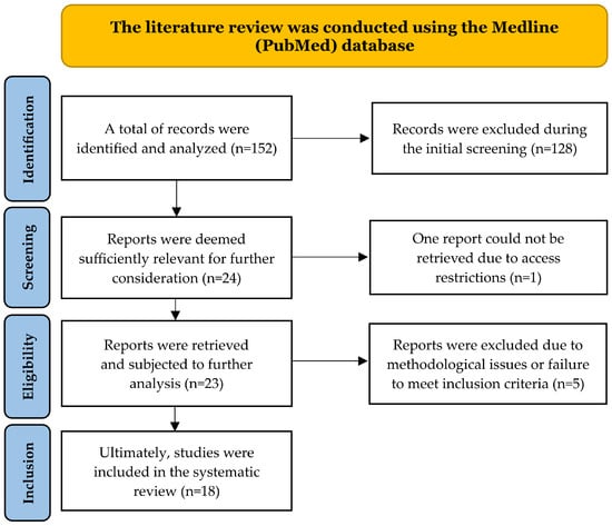 The literature review identified 152 publications meeting the initial Medline (PubMed) search criteria. At the identification stage, 128 articles were excluded because they did not meet the inclusion criteria (e.g., no analyzed association, incorrect population, inappropriate keywords after deeper analysis). Twenty-four publications were shortlisted for further selection. At the accessibility assessment stage, one report was excluded due to limited access to the full text. Five of the 23 analyzed publications were excluded at the eligibility assessment stage, mainly due to methodological issues or failure to meet the inclusion criteria. Finally, 18 articles were included in the systematic review. The study selection scheme is presented in Figure 1.