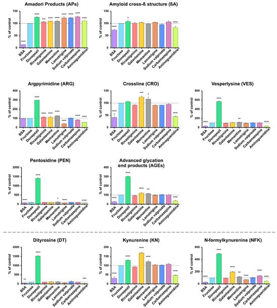 The inhibitory effects of donepezil, rivastigmine, galantamine, memantine, lamotrigine, sodium valproate, carbamazepine, and aminoguanidine on protein glycation and glycoxidation in fructose-induced glycation. APs, Amadori products; βA, amyloid cross-β structure; ARG, argpyrimidine; CRO, crossline; DT, dityrosine; KN, kynurenine; NFK, N-formylkynurenine; PEN, pentosidine; AGEs, advanced glycation end products; VES, vesperlysine; BSA, bovine serum albumin; fructose, albumin glycation induced by fructose; * p < 0.05 vs. positive control (glycating agent); ** p < 0.01 vs. positive control (glycating agent); *** p < 0.001 vs. positive control (glycating agent); **** p < 0.0001 vs. positive control (glycating agent).