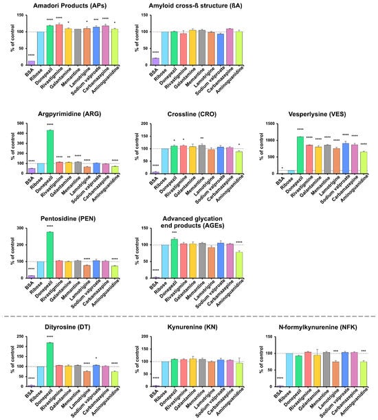 The inhibitory effects of donepezil, rivastigmine, galantamine, memantine, lamotrigine, sodium valproate, carbamazepine, and aminoguanidine on protein glycation and glycoxidation in ribose-induced glycation. APs, Amadori products; βA, amyloid cross-β structure; ARG, argpyrimidine; CRO, crossline; DT, dityrosine; KN, kynurenine; NFK, N-formylkynurenine; PEN, pentosidine; AGEs, advanced glycation end products; VES, vesperlysine; BSA, bovine serum albumin; fructose, albumin glycation induced by fructose; * p < 0.05 vs. positive control (glycating agent); ** p < 0.01 vs. positive control (glycating agent); *** p < 0.001 vs. positive control (glycating agent); **** p < 0.0001 vs. positive control (glycating agent).