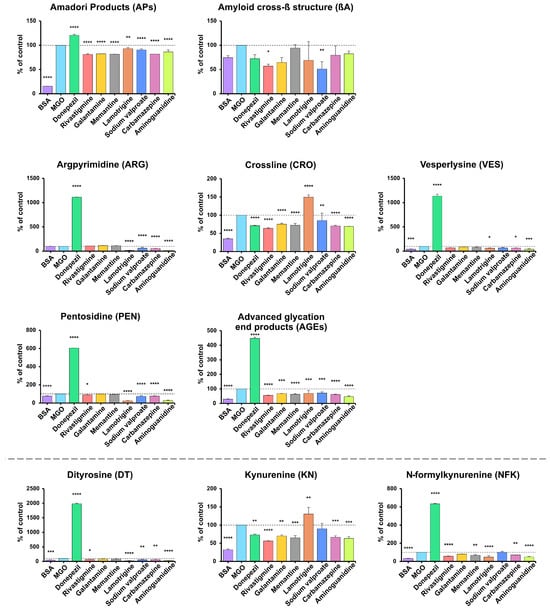 The inhibitory effects of donepezil, rivastigmine, galantamine, memantine, lamotrigine, sodium valproate, carbamazepine, and aminoguanidine on protein glycation and glycoxidation in MGO-induced glycation. APs, Amadori products; βA, amyloid cross-β structure; ARG, argpyrimidine; CRO, crossline; DT, dityrosine; KN, kynurenine; NFK, N-formylkynurenine; PEN, pentosidine; AGEs, advanced glycation end products; VES, vesperlysine; BSA, bovine serum albumin; MGO, methylglyoxal-induced glycation; * p < 0.05 vs. positive control (glycating agent); ** p < 0.01 vs. positive control (glycating agent); *** p < 0.001 vs. positive control (glycating agent); **** p < 0.0001 vs. positive control (glycating agent).