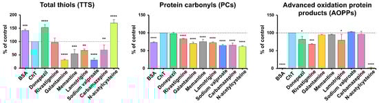 PCs levels were significantly lower in all samples compared with (BSA + ChT), with the most significant reductions in NAC –38.1% (a well-known antioxidant), sodium valproate (−35.33%), carbamazepine (−34.51%), galantamine (−29.83%), lamotrigine (−27.34%), BSA (−26.86%), memantine (−24.34%) and rivastigmine (−16.47%) (all p < 0.0001), while donepezil showed no significant change (Figure 5).