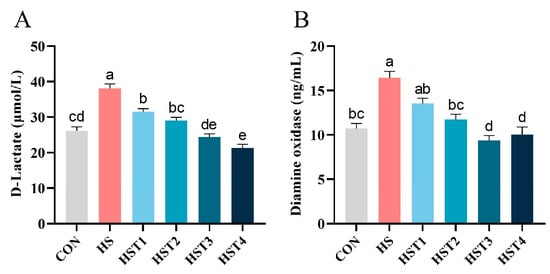 Effect of tributyrin on serum (A) D-lactate and (B) diamine oxidase in cyclic heat-stressed Taihe silky fowls. CON group = basal diet + thermoneutral temperature (24 ± 1 °C); HS group = basal diet + cyclic heat stress (CHS) conditions (34 ± 1 °C from 9: 30 to 17: 30 and 24 ± 1 °C for the rest of the time); HS + tributyrin groups (HST1, HST2, HST3, and HST4), basal diet + 0.04%, 0.08%, 0.16%, and 0.32% tributyrin + CHS conditions. a–e Groups without common letters differ significantly (p < 0.05). n = 5.