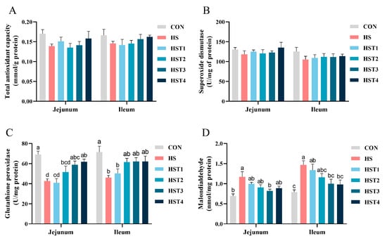 Effect of tributyrin on the antioxidant parameters in both jejunal and ileal mucosa in cyclic heat-stressed Taihe silky fowls. (A) Total antioxidant capacity, (B) superoxide dismutase, (C) glutathione peroxidase, and (D) malondialdehyde. CON group = basal diet + thermoneutral temperature (24 ± 1 °C); HS group = basal diet + cyclic heat stress (CHS) conditions (34 ± 1 °C from 9: 30 to 17: 30 and 24 ± 1 °C for the rest of the time); HS + tributyrin groups (HST1, HST2, HST3, and HST4), basal diet + 0.04%, 0.08%, 0.16%, and 0.32% tributyrin + CHS conditions. a–d Groups without common letters differ significantly (p < 0.05). n = 5.