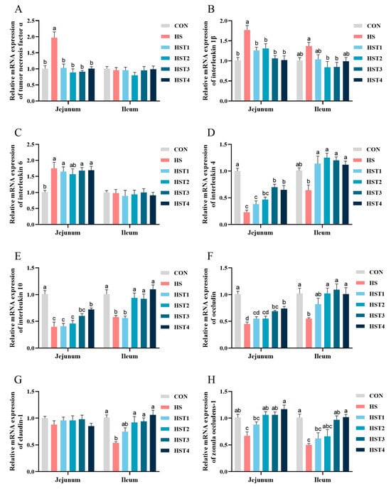 Effect of tributyrin on the mRNA abundance of jejunal and ileal mucosa in cyclic heat-stressed Taihe silky fowls. (A) Tumor necrosis factor α, (B) interleukin 1β, (C) interleukin 6, (D) interleukin-4, (E) interleukin-10, (F) occludin, (G) claudin-1, and (H) zonula occludens-1. CON group = basal diet + thermoneutral temperature (24 ± 1 °C); HS group = basal diet + cyclic heat stress (CHS) conditions (34 ± 1 °C from 9: 30 to 17: 30 and 24 ± 1 °C for the rest of the time); HS + tributyrin groups (HST1, HST2, HST3, and HST4), basal diet + 0.04%, 0.08%, 0.16%, and 0.32% tributyrin + CHS conditions. a–d Groups without common letters differ significantly (p < 0.05). n = 5.