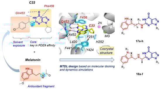 Since oxidative stress and impaired neuronal signaling are two major contributors to AD pathology, combining PDE9 inhibitors with antioxidants may offer synergistic benefits in treating AD. However, there are few reports on the combined use of PDE9 inhibitors with antioxidants or on the development of MTDLs that simultaneously target PDE9 and oxidative stress. With our continuous interest in designing MTDLs for AD [29,30], herein, we report the design and discovery of a series of pyrazolopyrimidinone derivatives inspired by the PDE9 inhibitor C33 developed by our group [31] and the antioxidant melatonin. These derivatives were evaluated as potent PDE9 inhibitors with good antioxidant activities comparable to melatonin, which will benefit AD drug development.