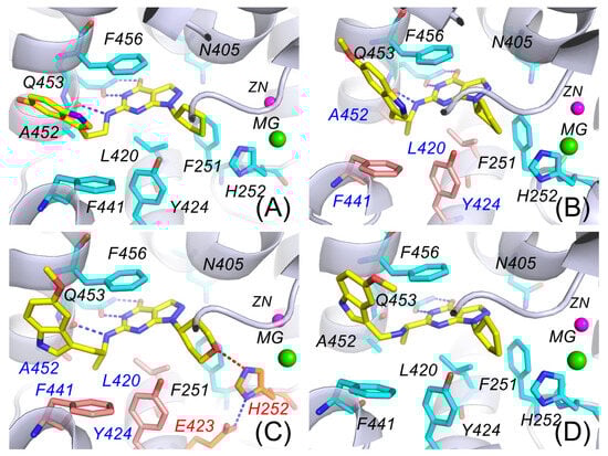 Proposed binding patterns of compounds 17b (A), 17c (B), 17d (C), and 18c (D) with PDE9 (PDB ID: 6A3N). A small hydrophobic pocket is composed of Ala452, Leu420, Tyr424, and Phe441, which are labeled as blue. Hydrogen bonds are depicted in blue dashed lines. Unfavorable electric repulsion is depicted in red dashed lines.