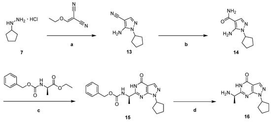 Synthetic route for intermediate 16. Reagents and conditions: (a) triethylamine, EtOH, 0 °C, 2 h, then reflux, 3 h; (b) 25% NH3·H2O, 30% H2O2, EtOH, r.t., 1 h; (c) 60% NaH, anhydrous THF, r.t., 8 h; (d) MeOH, Pd/C, H2, r.t., 24 h.