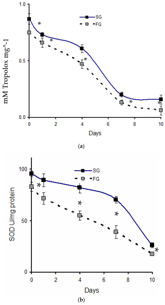 The reduction in total antioxidant capacity (TOAC) observed in postmortem SG and FG meagre fish fillets during cold storage is likely due to the combined effects of antioxidant consumption in neutralizing lipid oxidation products and oxidative damage to antioxidant molecules [,].