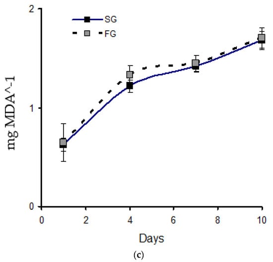 MDA levels of both fillet groups remained below the threshold value of 2.0 mg MDA.kg−1 during the ten-day storage period, indicating minimal lipid oxidation and satisfactory freshness [,]. There was a gradual increase, reaching MDA values above 1.5 mg MDA kg−1 by day 10 (Figure 2c) yet below the limit of 2.0 mg MDA kg−1, signaling the onset of rancidity. This finding contrasts with the initial expectation that the higher lipid content in slow-growing (SG) fish, particularly the elevated levels of polyunsaturated fatty acids (PUFAs)—which are more susceptible to oxidation than saturated fatty acids (SFAs)—would lead to more rapid lipid oxidation. However, no significant differences in lipid oxidation were observed between SG and fast-growing (FG) fillets, which suggests that factors beyond lipid content and PUFA composition, such as intrinsic antioxidant levels, may have played a key role in mitigating oxidation. The MDA values observed in this study are comparable to those reported by Matulik et al. [], who found oxidized tissue MDA levels in meagre ranging between 0.01 and 0.04 μmol g−1 (or 0.72 to 2.88 mg MDA.kg−1).