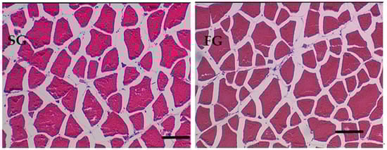Hematoxylin and eosin (H&E) stained transverse cross-sections of white epaxial muscle tissue of slow-growing (SG) and fast-growing (FG) reared meagre displaying the arrangement and size mosaic of muscle fibers. Bar scale: 100 μm.