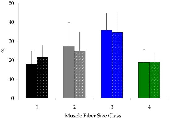 Frequency distribution (mean ± sd) of white muscle fibers cross-sectional area in the SG (solid bars) and FG (dotted bars) groups. Size classes: 1 (20–350 μm2); 2 (350–650 μm2); 3 (650–950 μm2); and 4 (>950 μm2). No significant differences were found between the two groups across any size class (ANOVA, p > 0.05).