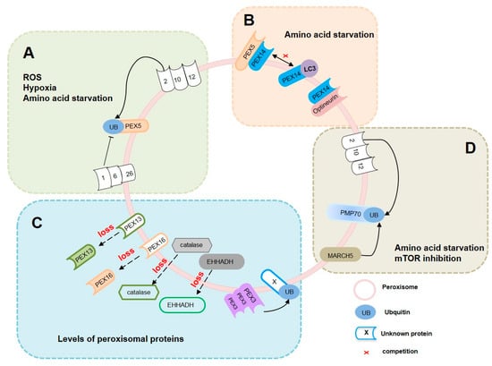 Peroxisomes are selectively recognized by receptors through their ubiquitin-binding domains (UBDs), and those peroxisomes interact with the LC3-interacting region (LIR) to be delivered to autophagosomes for pexophagy [24,25,26]. Two mammalian pexophagy receptors have been identified: NBR1 and p62 [27,28], which interact with ubiquitinated peroxisomal membrane proteins (PMPs) and sequester target peroxisomes into autophagosome. In addition, peroxisomes can be delivered for degradation through protein–protein interactions independently of their ubiquitin status [29,30]. Although the mechanisms and functions of pexophagy have been well studied and extensively reviewed, a critical gap still exists in our understanding of the complex regulatory networks of this process in mammalian cells.