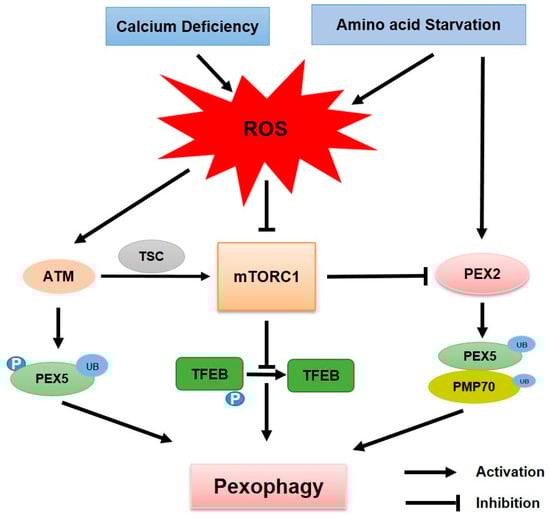 ROS serve as critical triggers for the initiation of pexophagy by signaling through different pathways. Upon activation by ROS, ataxia–telangiectasia mutated (ATM) translocates to damaged peroxisomes, where it represses mTORC1 and facilitates the mono-ubiquitination of PEX5 [48]. Consequently, ubiquitinated PEX5 is recognized by pexophagy receptors, such as NBR1 and p62, to induce pexophagy [48] (Figure 2). During amino acid starvation, oxidative stress is induced as ROS levels markedly increase [27,69]. Under amino acid starvation conditions, PEX2 is upregulated and functions as an E3 ubiquitin ligase that ubiquitinates PEX5 and PMP70. Ubiquitinated proteins are subsequently recognized by NBR1 during pexophagy [27] (Figure 2). Calcium deficiency in the medium decreases the catalytic activity of peroxisomal catalase, resulting in the accumulation of ROS, which inhibits mTOR activity and activates the transcription factor EB (TFEB). The inactivation of mTORC1 inhibits TFEB phosphorylation and promotes its nuclear translocation into the nucleus. TFEB stimulates the transcription of genes involved in lysosomal biogenesis and autophagy, enhancing autophagic flux, which leads to pexophagy to remove the oxidative stress present within the cell [7] (Figure 2). Interestingly, in response to peroxisomal ROS, ATM activates the tuberous sclerosis complex (TSC), which localizes to peroxisomes, inhibits mTORC1, and promotes autophagy [70]. Given that the mTORC1 pathway has been implicated in the regulation of pexophagy by controlling PEX2 expression, these findings suggest that mTORC1 serves as a central regulator of pexophagy by coordinating cellular responses to oxidative stress and nutrient deprivation. Although these interactions highlight an important link between ROS, mTORC1 activity, and pexophagy, further studies are required to determine the precise mechanisms by which ROS regulate pexophagy.