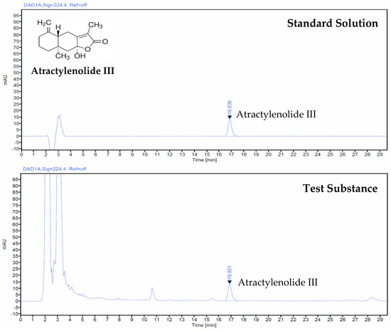 HPLC chromatogram displaying atractylenolide III in both standard solution and root extracts of Atractylodes japonica Koidz. ex Kitam.