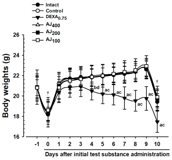 Body weight changes in mice with intact or PM2.5-induced pulmonary injury. Values are presented as means ± SD for 10 mice per group. PM2.5 refers to diesel particulate matter NIST 1650b; DEXA denotes dexamethasone; AJ stands for Atractylodis Rhizoma, the root extract of Atractylodes japonica Koidz. ex Kitam; THSD represents Tukey’s Honest Significant Difference. ‘Day-1’ indicates one day prior to the initial administration of the test substance, while ‘Day 10’ represents the day of sacrifice, 24 h after the final administration of the test substance. All animals were fasted overnight before the initial administration of the test substance and before sacrifice (†). Significance is marked as a p < 0.01 and b p < 0.05 when compared with the intact vehicle control using the THSD test; c p < 0.01 and d p < 0.05 when compared with the PM2.5 control using the THSD test.
